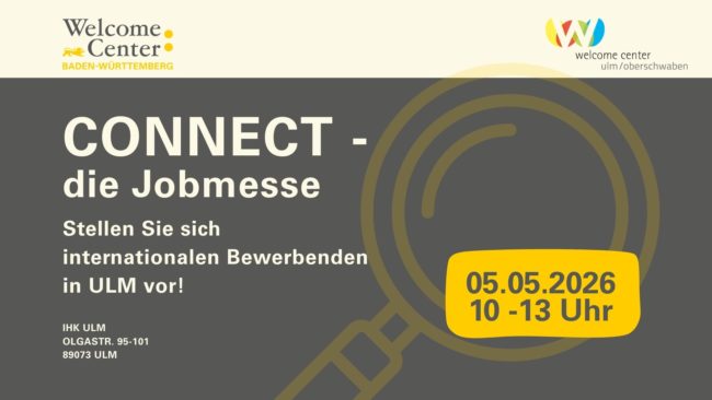 Sie leben in der Region Ulm, sind neu in Deutschland und auf der Suche nach einem Job, einer Ausbildung oder beruflichen Perspektiven? Dann ist die Jobmesse CONNECT genau das Richtige für Sie! Am Dienstag, 05. Mai 2026, von 10:00 bis 13:00 Uhr, findet in der IHK Ulm (Olgastr. 95-101, 89073 Ulm) erneut die Jobmesse CONNECT – Jobmesse für internationale Bewerbende statt.…